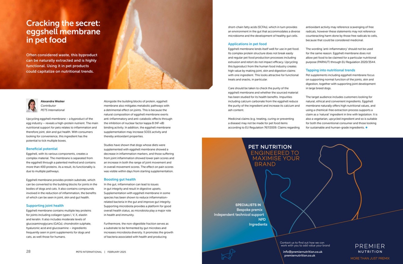Eggshell membrane lends itself well for use in pet food. Its complex protein structure does not break easily and regular pet food production processes including extrusion and retort do not impact efficacy. Upcycling this byproduct from the human food industry creates high value by making joint, skin and digestion claims with one ingredient. This looks attractive for functional treats and snacks, in particular.